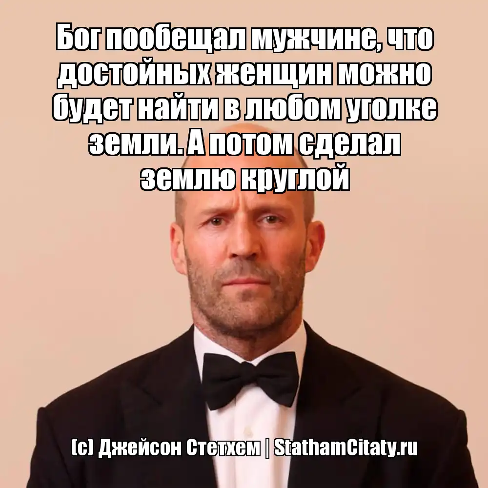Бог пообещал мужчине, что достойных женщин можно будет найти в любом уголке земли. А потом сделал землю круглой (с) Джейсон Стетхем