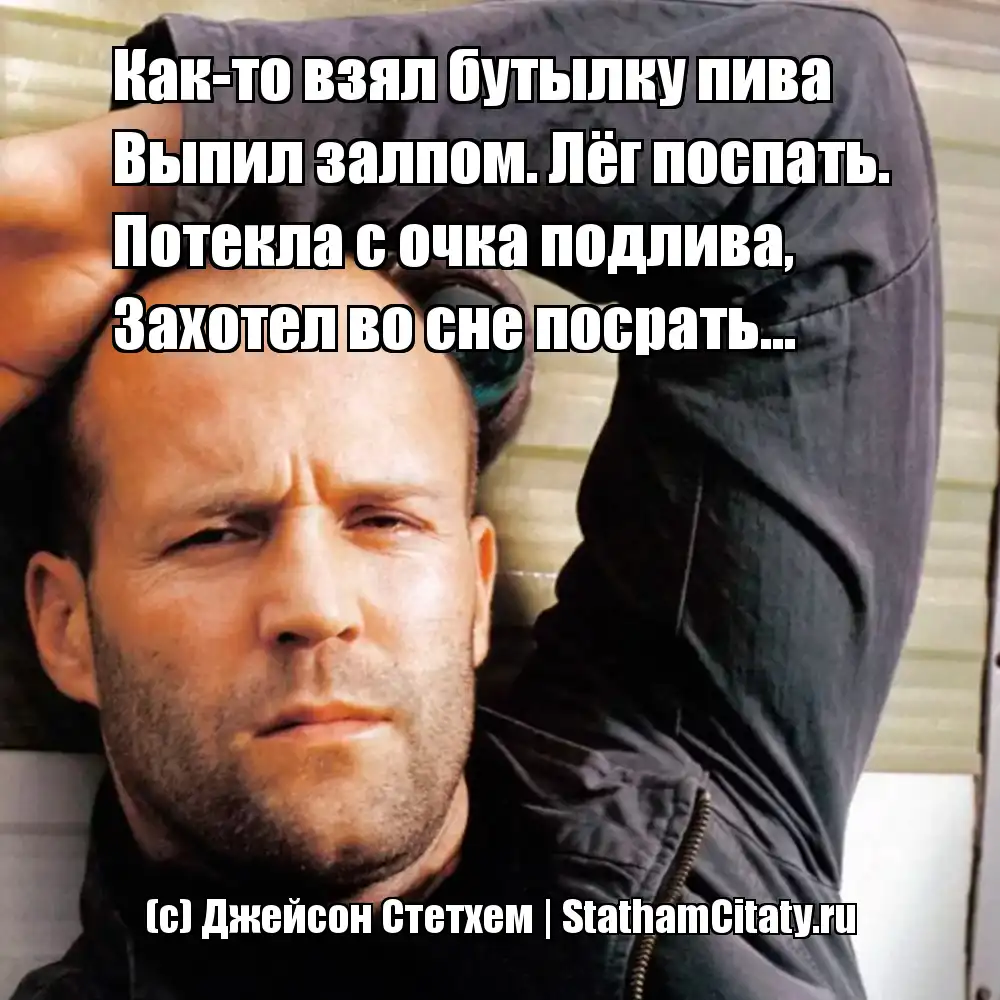 Как-то взял бутылку пива Выпил залпом. Лёг поспать. Потекла с очка подлива, Захотел во сне посрать... (с) Джейсон Стетхем