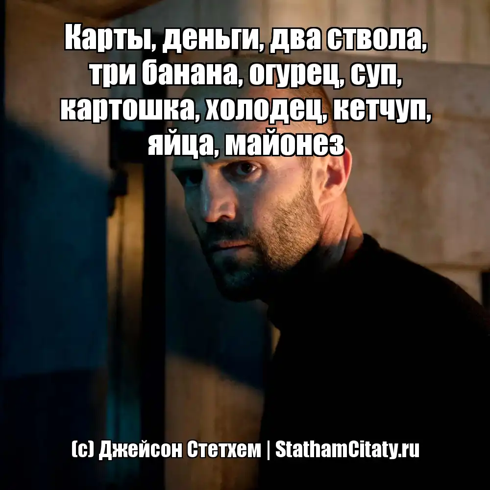 Карты, деньги, два ствола, три банана, огурец, суп, картошка, холодец, кетчуп, яйца, майонез (с) Джейсон Стетхем