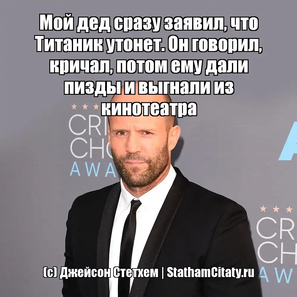 Мой дед сразу заявил, что Титаник утонет. Он говорил, кричал, потом ему дали пизды и выгнали из кинотеатра (с) Джейсон Стетхем