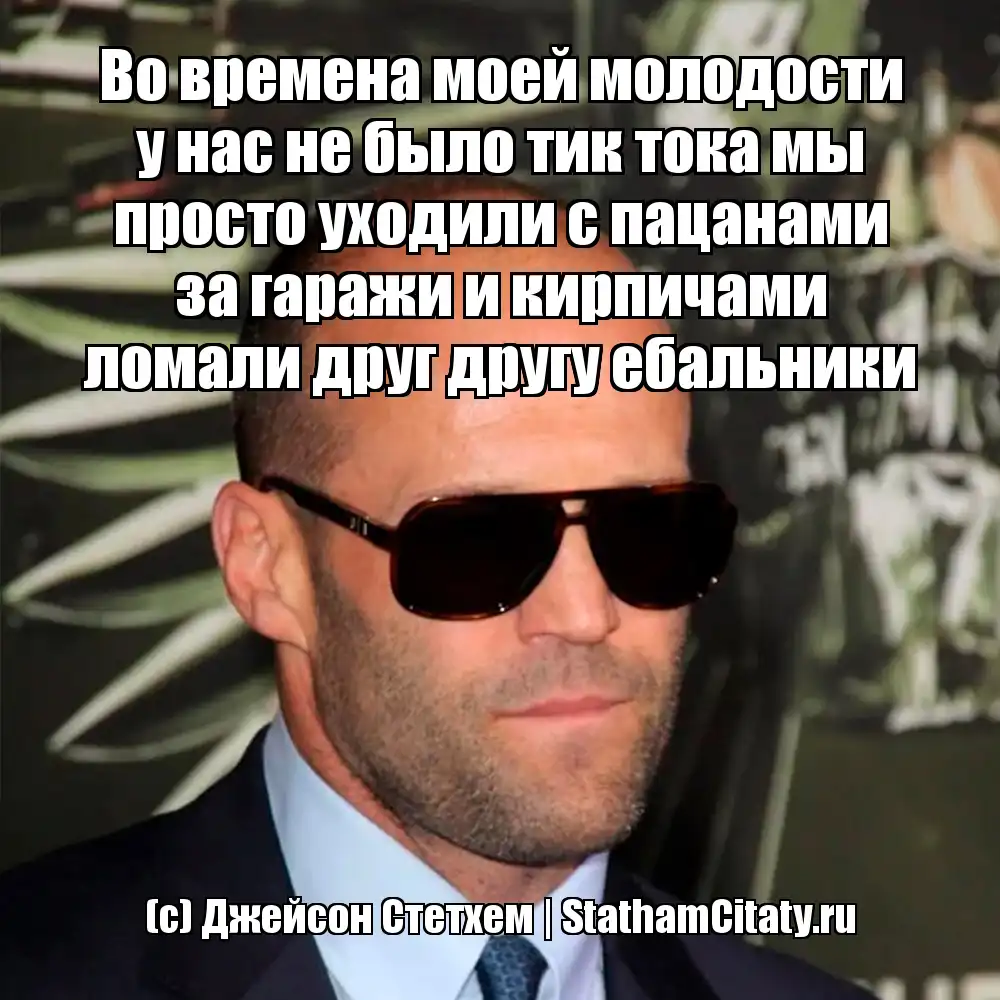 Во времена моей молодости у нас не было тик тока мы просто уходили с пацанами за гаражи и кирпичами ломали друг другу ебальники (с) Джейсон Стетхем